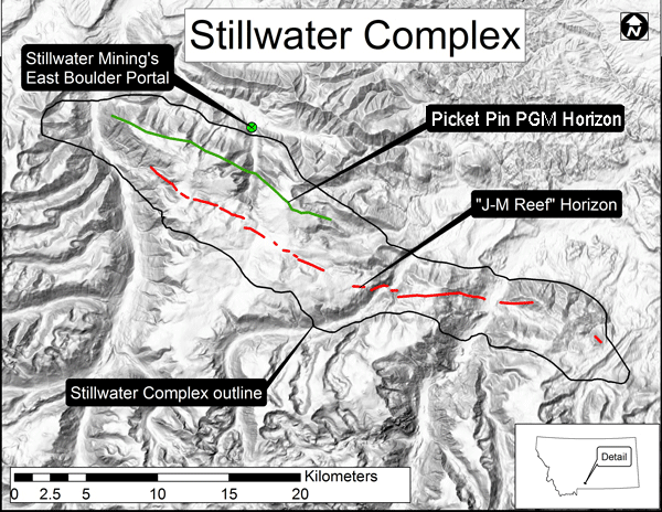 The Picket Pin PGM mineralization is associated with disseminated sulfides hosted within an anorthosite member, located near the contact between the Middle and Upper Banded Series of the Stillwater Complex. The sulfide zone is strata bound, laterally continuous (up to 2 meters thick) with podiform and lenticular shape. Sulfide PGM mineralization is also associated with pipe-like feeder zones that are approximately 50 meters thick in diameter and extend down to 150 meters below the main horizon.